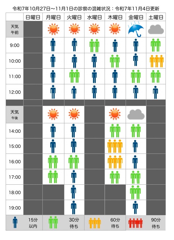 混雑状況:10月27日(月)〜11月1日(土) 2025年11月4日 お知らせ 先週1週間の診察の混雑状況です。 混雑する時間帯もあり、お待たせする時間が長くなってしまいました。 少しでも待ち時間が少なくなるよう、スタッフ一同努めてまいります。 当院では様々な感染対策に取り組みながら、安心して来院できる環境作りに 努めておりますので、安心してご来院ください。 また予約システムを導入しましたので、ホームページからの診察予約も承っております。ぜひ、ご利用ください。
