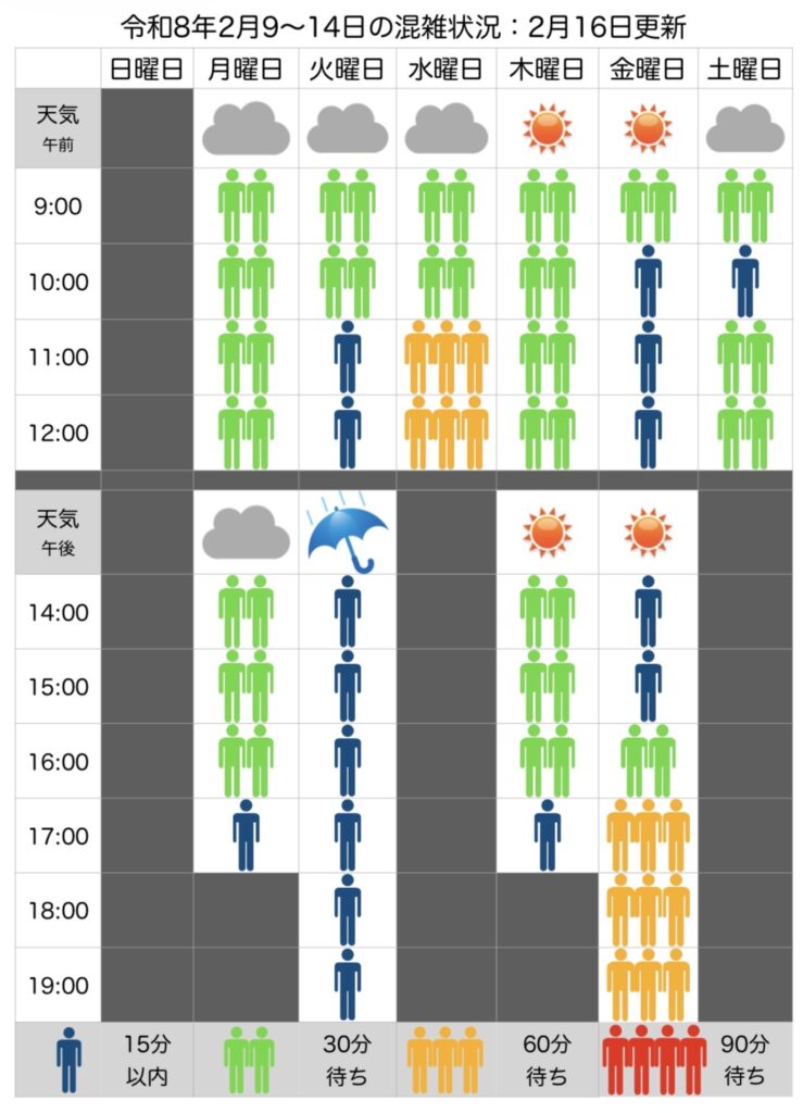 混雑状況:2月9日(月)〜2月14日(土) 2026年02月16日 お知らせ 先週1週間の診察の混雑状況です。 混雑する時間帯もあり、お待たせする時間が長くなってしまいました。 少しでも待ち時間が少なくなるよう、スタッフ一同努めてまいります。 当院では様々な感染対策に取り組みながら、安心して来院できる環境作りに 努めておりますので、安心してご来院ください。 Screenshot また予約システムを導入しましたので、ホームページからの診察予約も承っております。ぜひ、ご利用ください。