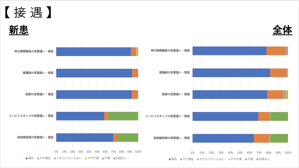 ③ 接遇については受付、看護師、医師ともいずれも95%以上の方に満足またはやや満足とお答え頂き、コメントでも「安心できる」、「気持ちよく利用できる」、「丁寧な対応」などのお声をいただきました。