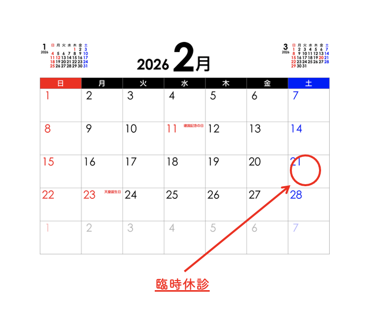 臨時休診のお知らせ 2026年01月25日 お知らせ 令和8年2月21日(土)は研修会への出席のため、休診とさせていただきます。2月22日が日曜日、2月23日が祝日(天皇誕生日)ですので3連休となります。 ご迷惑をおかけしますが、宜しくお願い致します。