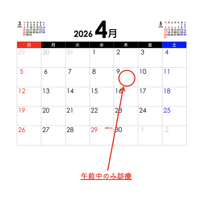 院内研修のための臨時休診のお知らせ。 2026年03月25日 お知らせ 和8年4月9日(木)は院内研修のため、午後の診療を休診させていただきます。当日は午前9時から12時30分まで(初めての方は12時まで)の午前中のみの診療となります。ご迷惑をおかけしますが、宜しくお願い致します。