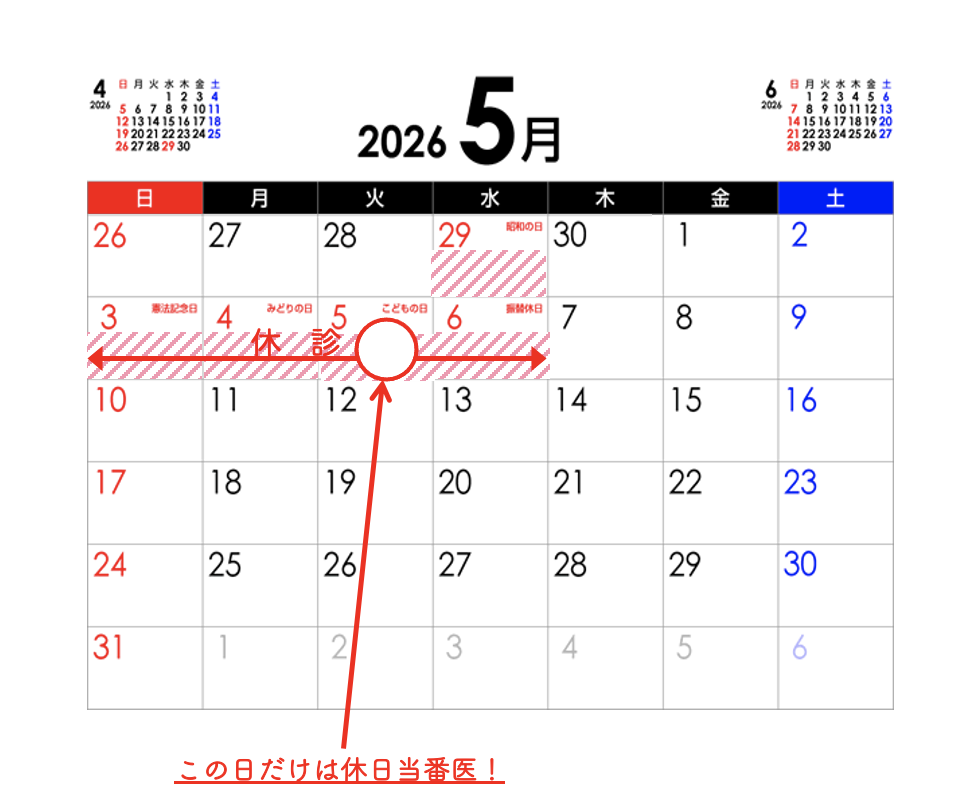 ゴールデンウィークの休診のお知らせ 2026年04月19日 お知らせ 本年のゴールデンウィークは、暦通り日曜日と祝日が休診になります。 4月29日(水)と5月3日(日)から5月6日(水)までの4日間は休診とさせて頂きます。但し、5月5日(火)は熊本市の休日当番医を務めますので、急な怪我や痛みなどでお困りの方は9時から17時まで診療しておりますのでどうぞご来院ください。 ご迷惑をお掛け致しますが、宜しくお願い致します。
